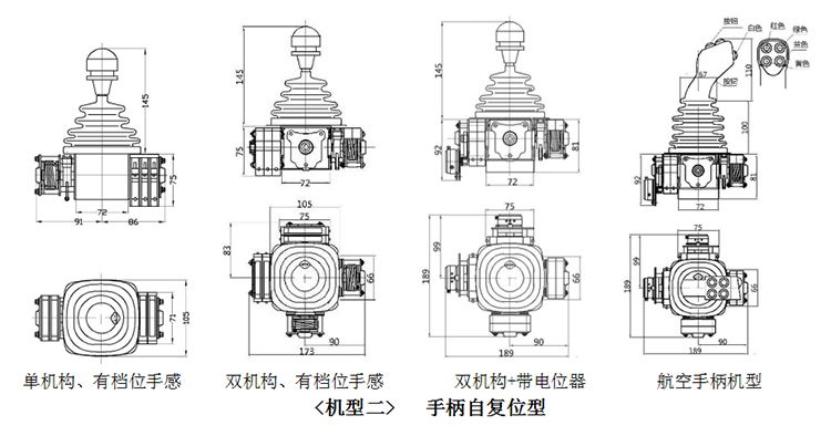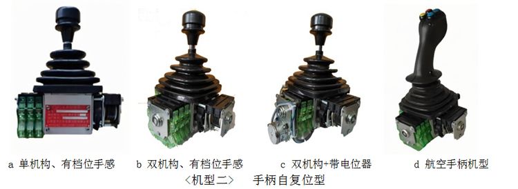 机型二:手柄自复位。细分有三种结构形式:1).手柄自复位、有档位手感 2)手柄自复位+带电位器 3).航空手柄自复位