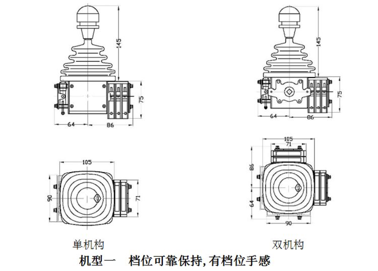 第 一种机型:档位保持可靠型、有档位手感,输出开关量信号。适用于习惯该类档位保持机型的操作人员使用。另一个优点是设备运行距离较长时,操作员可选定合适的档位,松开手柄,手柄停留在设定的档位上,设备自动运行。