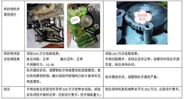 操纵杆防尘罩已彻底坏掉,检查发现末档无电器开关量信号,拆解发现是触点坏掉。另外还发现,三档凸轮片因与棘轮档位不同步,因触点在档位上无信号,工人装配时,对凸轮片角度进行了修理。凸轮片上被装配工修挫的痕迹还明显存在。这说明产品棘轮档位和凸轮片相对应的工作部位同步性达不到要求,所以需要装配时,工人现场修锉。据用户讲,该机被拆下来时,在焦化厂的煤焦车上已用了2年多的时间,这也到了其使用寿命。触头组有三种不同的规格,但均为桥式双断点。凸轮片为扇形(2mm厚),紧密套装在凸轮轴上。因凸轮片太薄,触头组的动触桥顶杆前端与凸轮片接触应力偏大,造成不耐磨,其电寿命估计在150万次左右,和用户告知的使用年限基本相吻合。此操纵杆触头组属于易损件,有快换拆卸结构。另外,棘轮档位控制和保档机构十分可靠,这是个亮点设计。